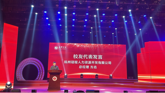 涉外秘书专业2002届毕业生、冠程人力资源开发有限公司总经理、杭州市政府创业导师方垚作为校友代表在学校办学108周年暨2002届校友毕业20周年庆祝大会发言。