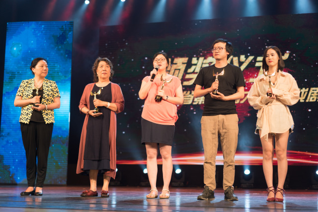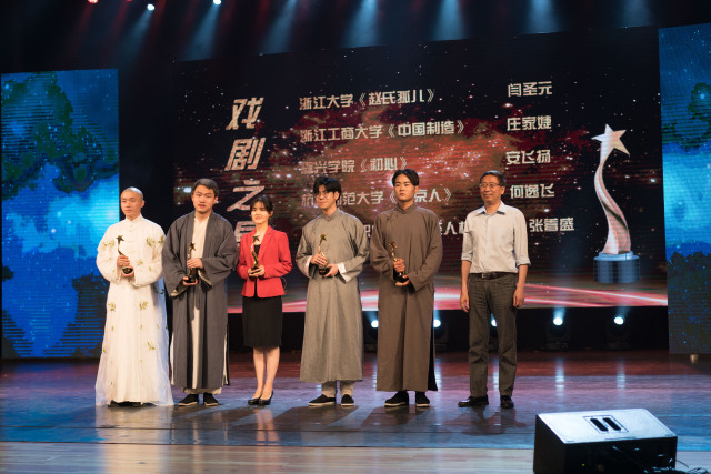 王金超同学获得话剧周导演奖。另外的导演奖获奖者有方桂林、沈骁婧、桂迎、史昕。《初心》中的安飞扬同学(饰毛泽东)获得“戏剧之星”。其余获奖者为“戏剧之星”获得者是何逸飞(杭州师范大学《北京人》)、庄家婕(浙江工商大学《中国制造》)、闫圣元(浙江大学《赵氏孤儿》)、张着盛(浙江艺术职业学院《茶人杭天醉》)。演员扎实的台词功底,富有感染力的舞台表现力让每一个观众都大呼过瘾,掌声久响不歇。