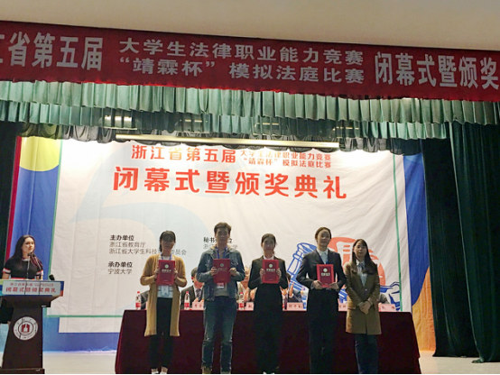 2018年11月9日至11日,浙江省第五届大学生法律职业能力竞赛——“靖霖杯”模拟法庭比赛在宁波大学举行。省内共有29所高校,32支队伍参加了本次比赛。经过一天半的初赛后,由前四名抽签进行决赛,最终产生了本届比赛的各类奖项。我校代表队在众多实力强劲的高校中表现优良,荣获二等奖!