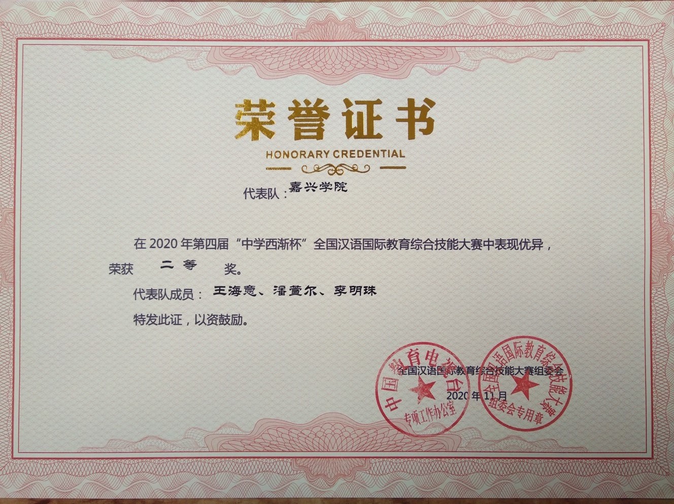 本届大赛引入在线直播教学的竞赛形式,借助互联网教育企业的技术优势,采用“汉语国际教育直播教学平台”为参赛队伍提供实施汉语教学的全套流程和线上环境。来自汉语国际教育专业的王海意、潘萱尔、李明珠三位同学代表学校首次参赛,充分展现了嘉院学子的气度风采,在初赛阶段取得了小组第五的好成绩,最终荣获全国二等奖。