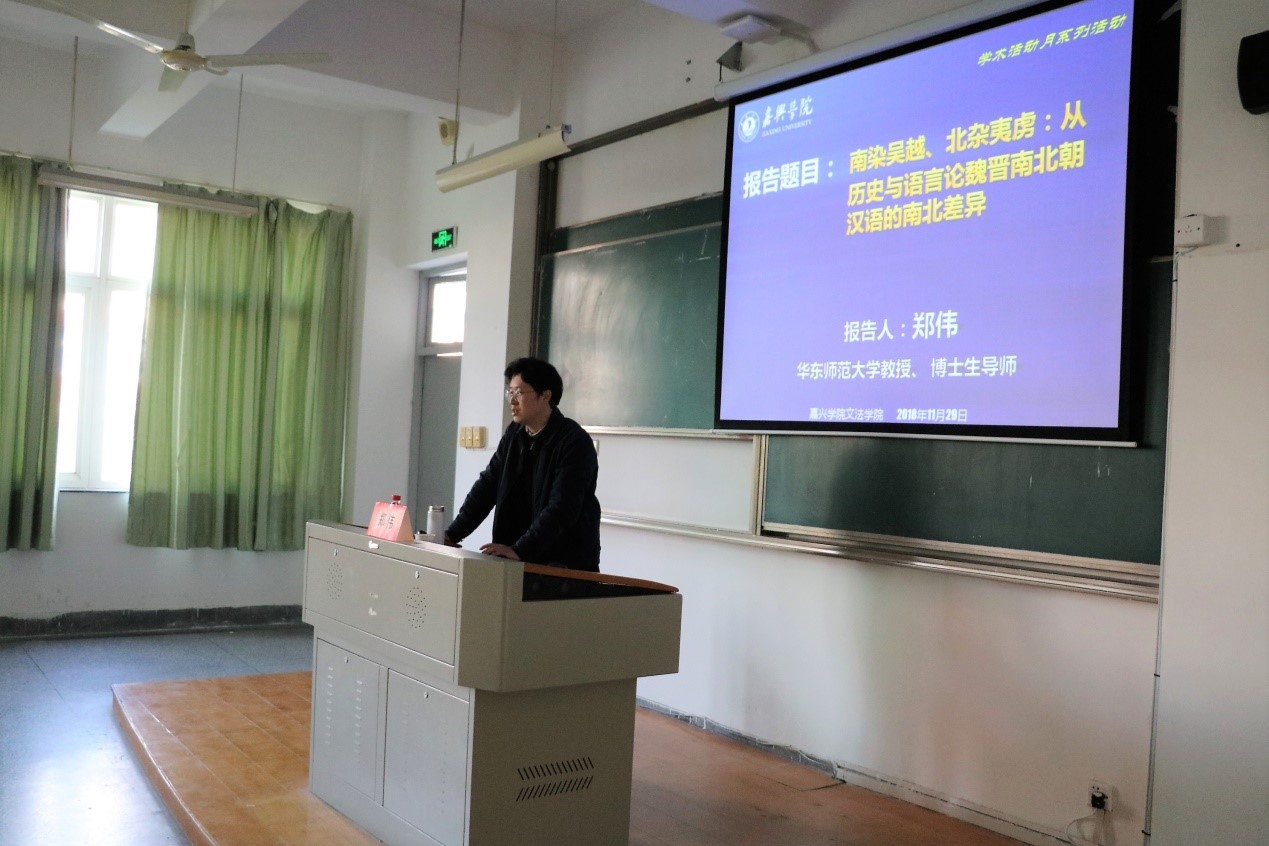 郑伟教授从历史文献和语言学两个方面,阐述了魏晋南北朝时期汉语的南北地理差异。他通过结合南方少数民族语言特点,详细阐述了颜之推《颜氏家训·音辞篇》所说的“南染吴越”和 “北杂夷虏”。报告还涉及了邪、禅船、云匣、麻佳、鱼虞、支脂诸音类在汉语南北方言的分合问题。郑伟教授还与学生们进行了深入探讨,回答了学生们提出的问题。学生们被郑伟教授精彩的演讲,深厚的学识深深吸引,现场掌声不断。