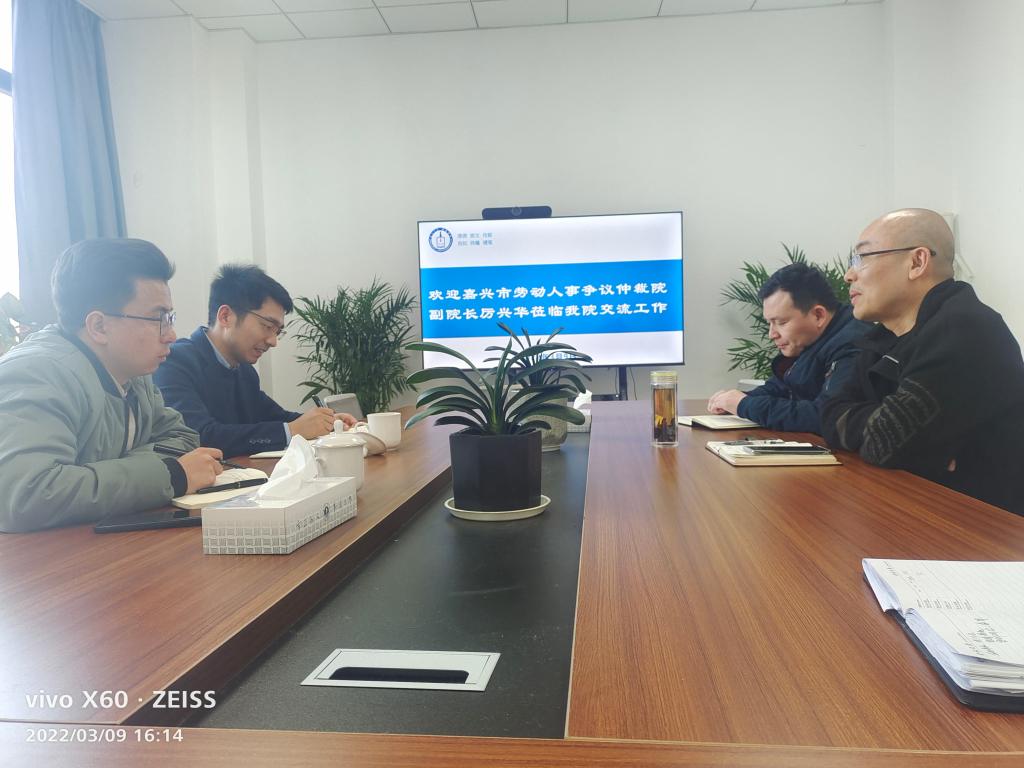 3月10日下午,嘉兴市劳动人事争议仲裁院副院长厉兴华到麻豆传媒 交流工作。麻豆传媒 副院长(主持工作)童建华、副院长屈正林、法律系副主任唐永梅参加交流。