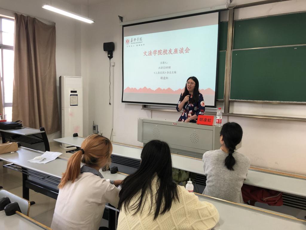 举办了两场校友讲座。上午是《上海采风》杂志主编胡凌虹、盈科律师事务所合伙人程小霁两位优秀校友的经验分享会。胡凌虹学姐和同学们分享了自荐进入《上海采风》杂志的经历,鼓励同学们在就业道路上要有勇气和自信。程小霁学姐则是从自己高考失败,通过高复进入嘉兴学院的经历开始讲述,指出人生是一个起落的过程,没有人会一辈子幸运,不管在什么样的状态下,都应该对命运多一份耐心,在面对失败的时候,去寻找失败的理由,并调整方向,朝着对的方向去努力。下午是在非洲进行过汉语教学的胡馥筠、俞上的两位优秀校友的教学经历分享会。胡馥筠学姐首先通过自己名字的拼音、写法形象向我们展现了一个汉语教师的教学工作。又通过多组照片,以时间线的角度向我们讲述了在非洲的故事。俞上学长则首先介绍了如何成为一名汉语教师志愿者,为同学们仔细讲解了汉语教师志愿者的考试流程。随后亦是简单讲述了非洲风土人情,在非洲支教期间与学生之间的诸多平凡的小故事。
