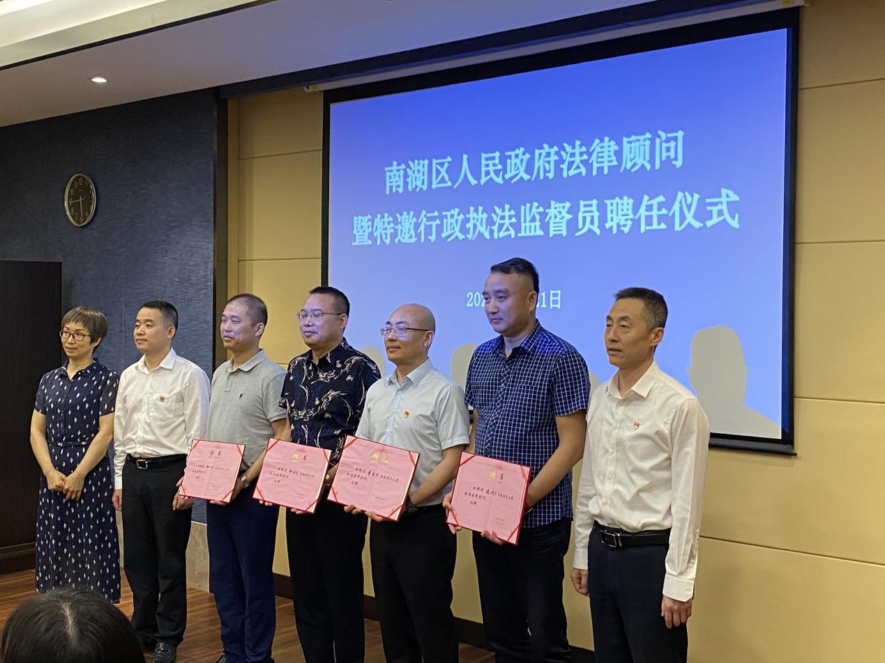 5月21日上午,在南湖区政府10号会议室,麻豆传媒 副院长童建华受聘为南湖区人民政府法律顾问和特邀行政执法监督员。