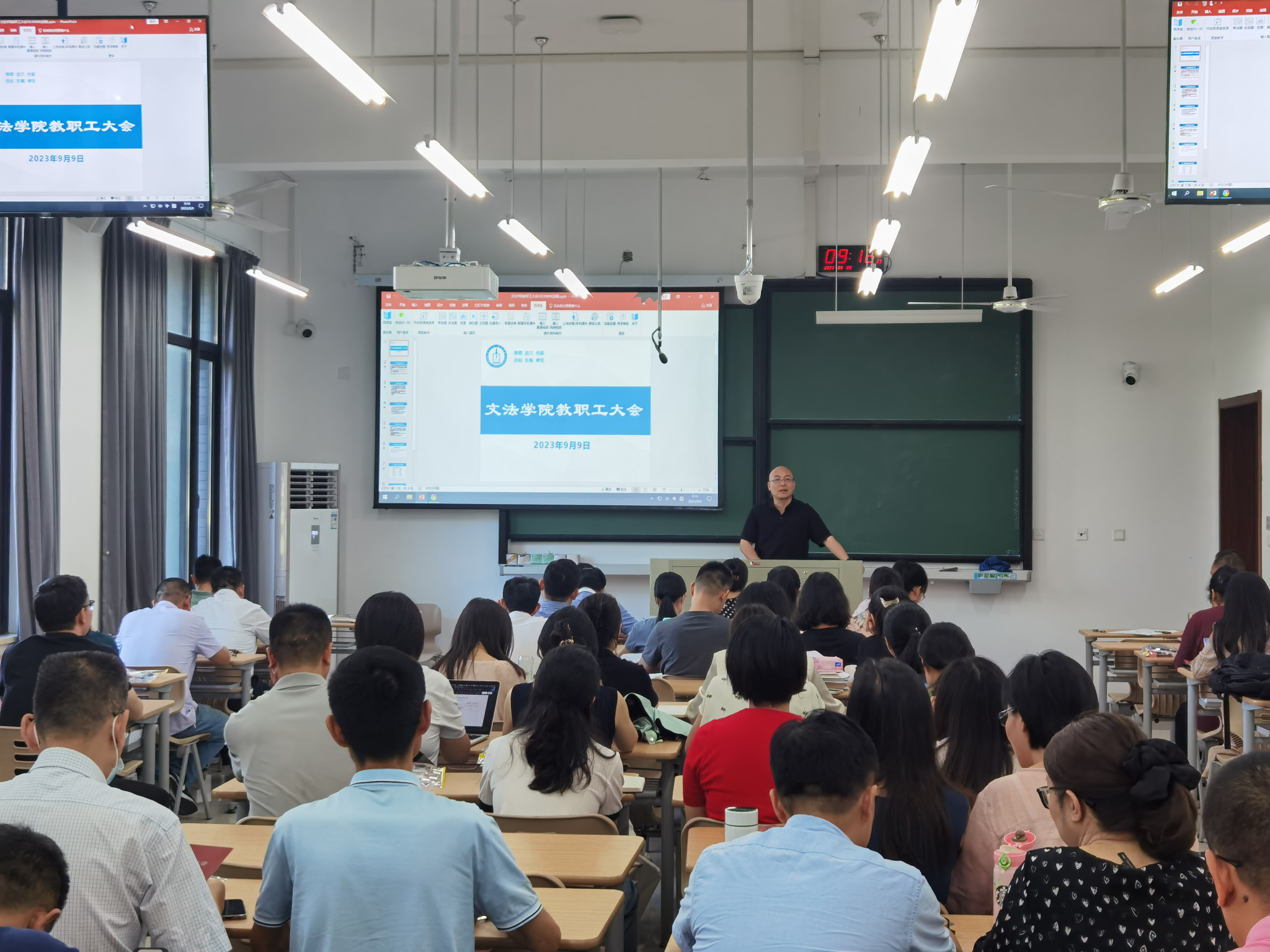 在厚德楼150教室召开新学期第一次全体教职工会议。会议由副院长(主持工作)童建华主持。