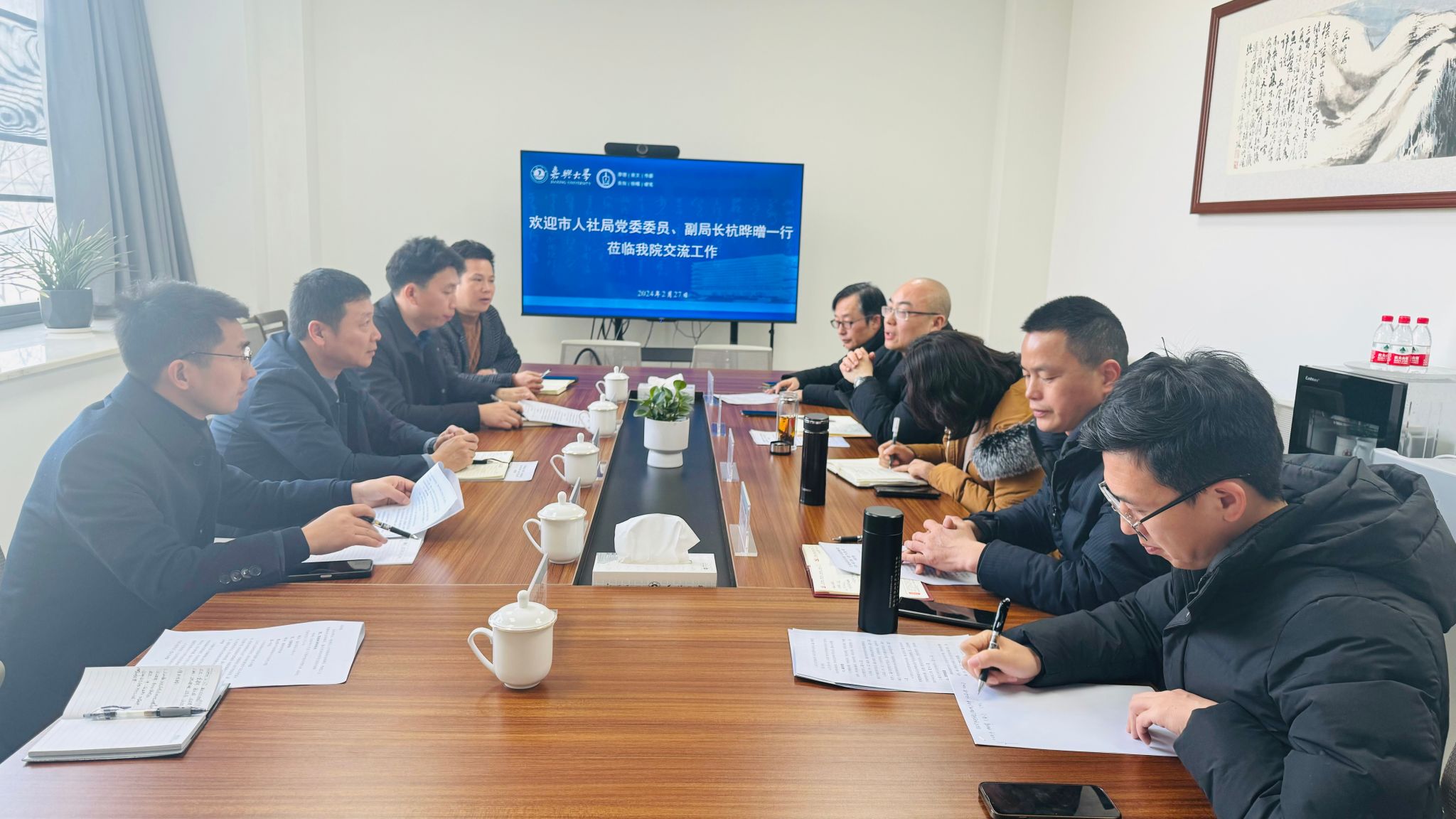 2月27日上午,嘉兴市人社局党委委员、副局长杭晔㬝一行5人来麻豆传媒 交流工作。会议由学院党委书记童建华主持,法学系主任唐永梅,副主任杨永磊,法学系教师周述荣等参加座谈交流。