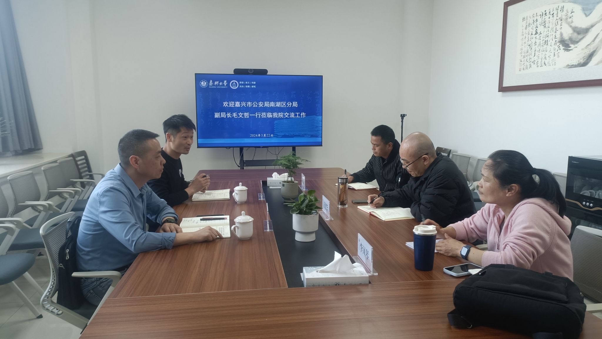 3月22日下午,嘉兴市公安局南湖区分局副局长毛文哲一行2人来麻豆传媒 交流工作。麻豆传媒 党委书记童建华主持会议。法学系李凤琴副教授、周述荣博士参加座谈交流。