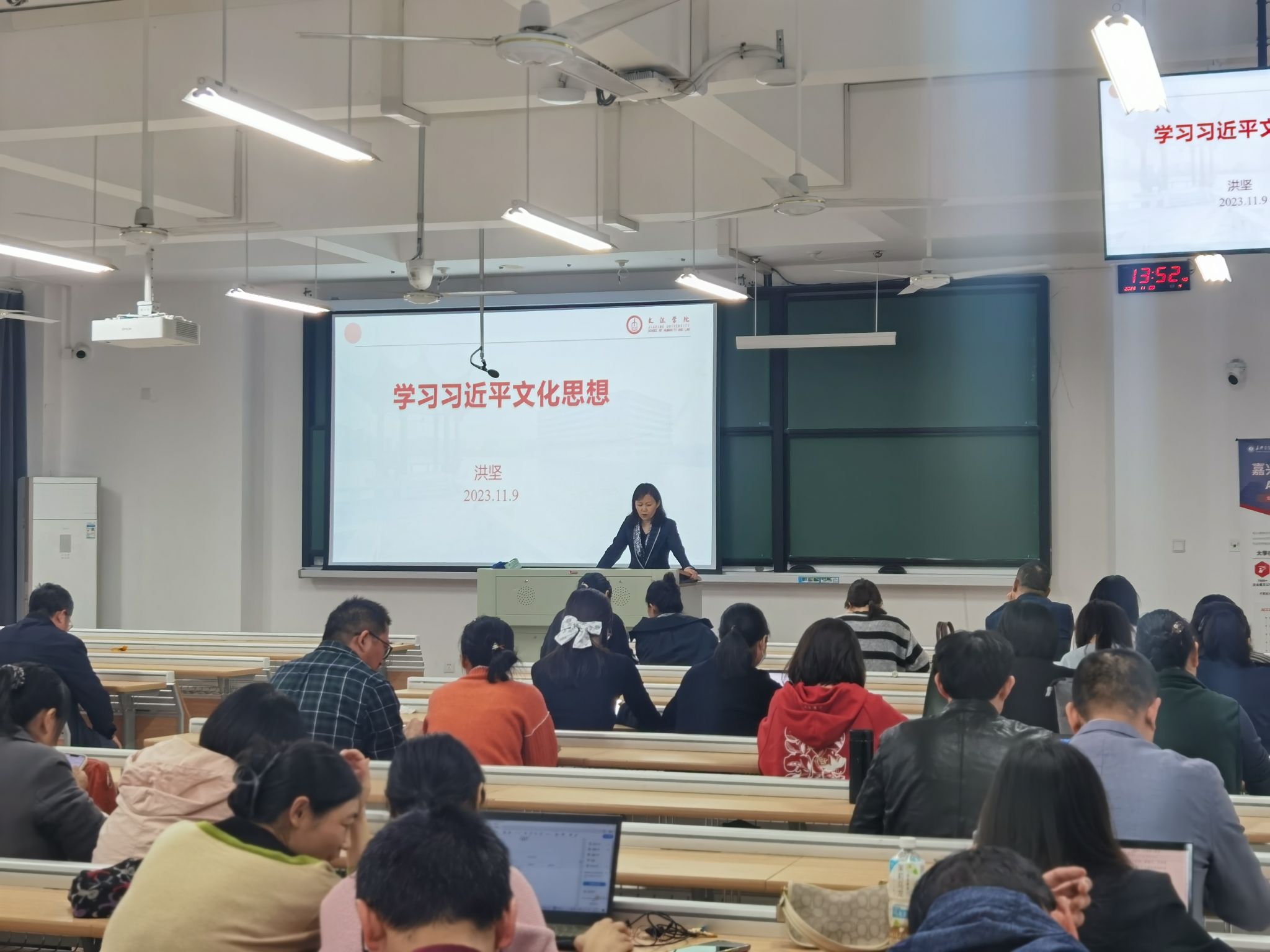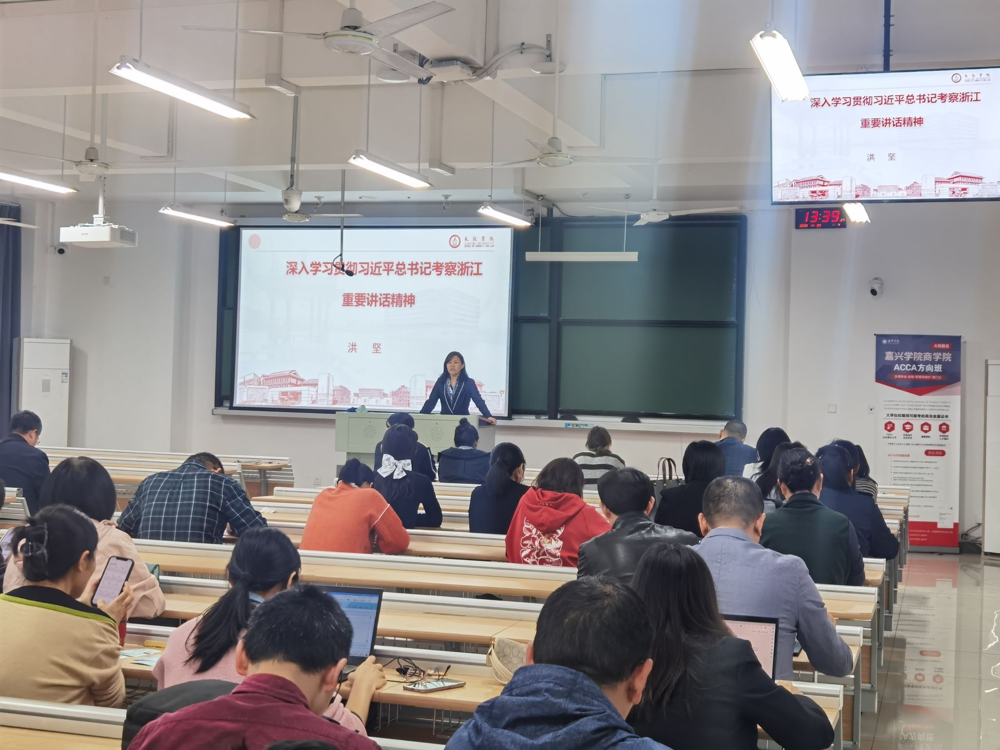 洪坚带领大家共同学习了习近平总书记在浙江考察时的重要讲话精神和习近平文化思想。洪坚指出,全院师生要以习近平总书记考察浙江重要讲话精神为引领推进各项工作。要深学细悟,坚决把思想和行动统一到贯彻落实习近平总书记重要讲话精神上来;要做到真信笃行,营造氛围、入脑入心,持续掀起学习宣传贯彻的热潮;要做到实干担当,坚持在创造性贯彻落实、创新性转化发展上下功夫、求实效;要做到求真务实,聚焦中心工作,推动学院教育事业持续高质量发展。