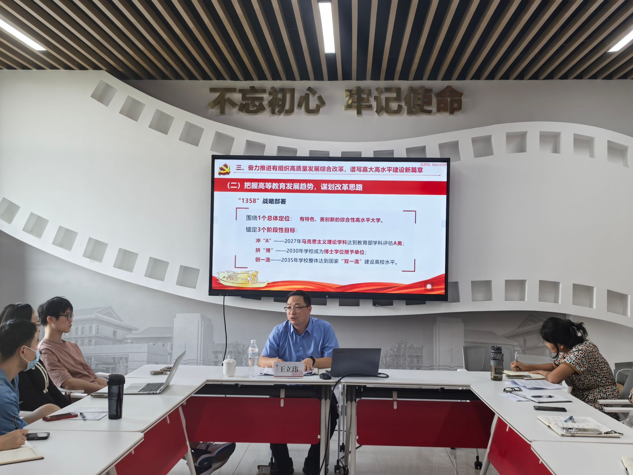 王立玮以《深入学习贯彻党的二十届三中全会精神加快建设有特色、善创新的综合性高水平大学》为题,对党的二十届三中全会精神进行了全面解读。以党的二十届三中全会的历史地位为切入点,结合国内国际近期的时事政治,深刻阐述了进一步全面深化改革的重大意义,同时结合省委十五届五次全会精神,强调要结合工作实际,把握进一步全面深化改革的各项重点任务,特别是在教育、科技、人才领域教师要承担的责任和使命,每位教职工都要在落实立德树人根本任务中担当尽责,力争到2035年实现“冲A、拼‘博’、创一流”的奋斗目标,为推动学校事业高质量发展贡献文法力量。