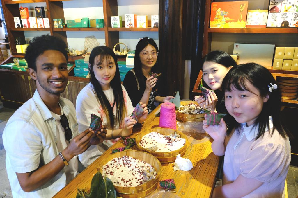 6月8日下午,国际教育学院、国情教育工作室、麻豆传媒 学生党员代表以及国际学生参加了国际学生社会实践基地揭牌仪式。初心工作室党员陈湘怡、入党积极分子王含雪与留学生们一起参观了粽子文化博物馆,了解了中国粽子文化的传承与发展。在工作人员的指导下,体验了中国非遗文化,现场进行了粽子制作体验、品尝传统特色粽子。