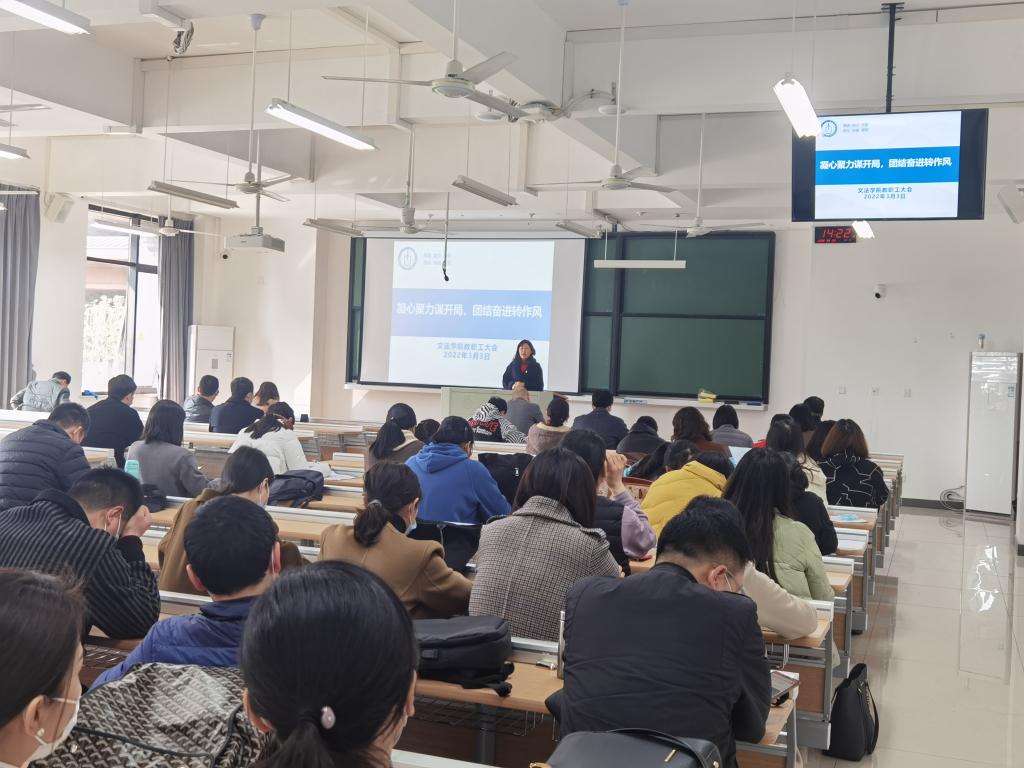 在厚德楼122召开教职工大会,开展集中学习和主题党日活动,会议由党委书记洪坚主持。