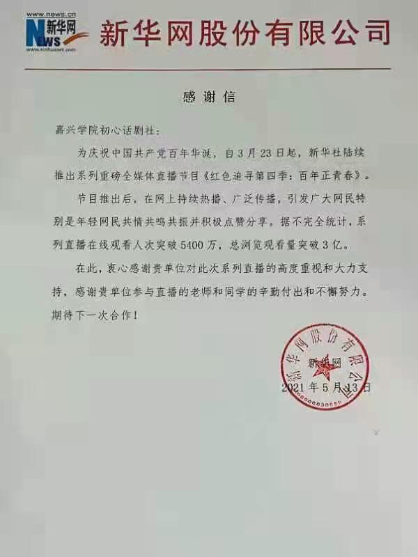 2021年5月13日,嘉兴学院初心话剧社收到了来自新华社的一封感谢信。信中新华社表示,为了庆祝中国共产党百年华诞,自3月23日起,陆续推出的系列重磅全媒体直播节目《红色追寻第四季:百年正青春》在网上持续热播、广泛传播,引发了广大网民特别是年轻网民共情共鸣共振并积极点赞分享,据不完全统计,系列直播在线观看人次突破5400万,总浏览观看量突破3亿。